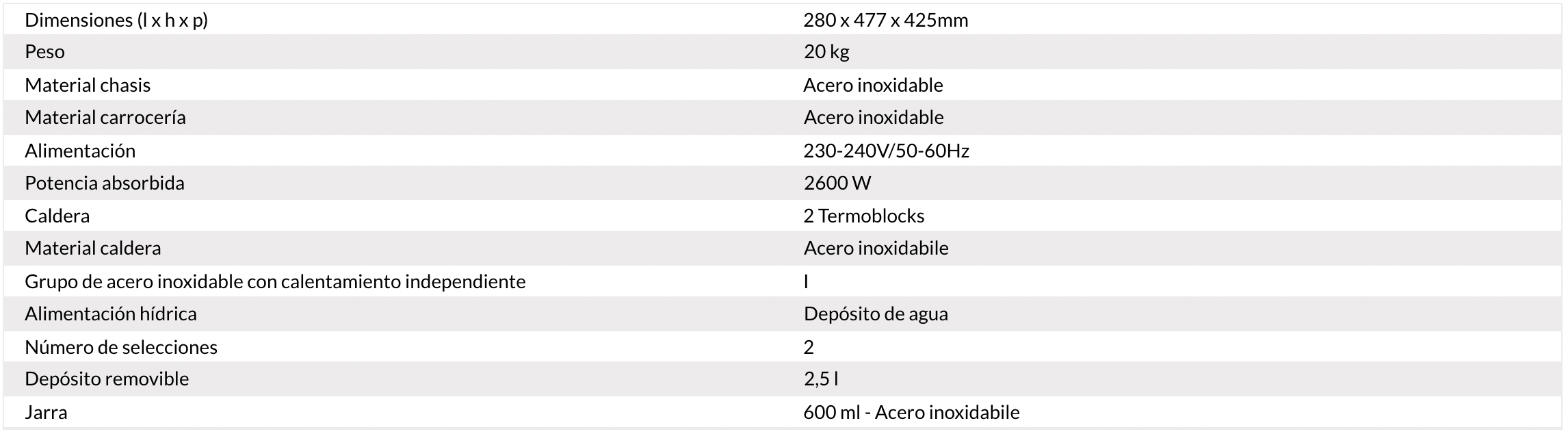 - Espresso simple o doble programable en longitud o mediante palanca para dispensación manual.